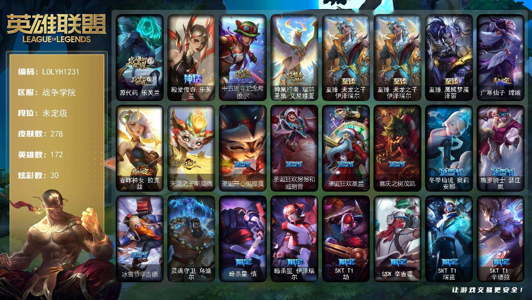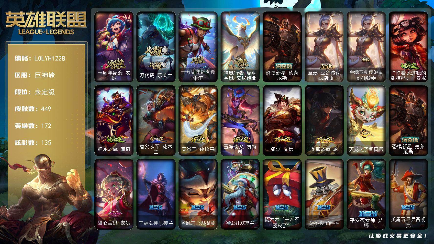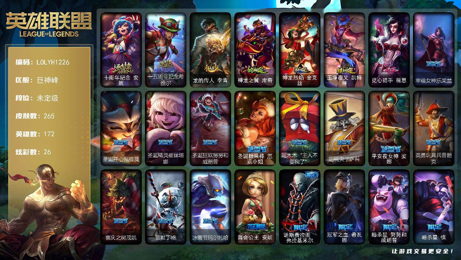 172英雄/265皮肤/2神话/45限定/2臻彩/26炫彩/20传说/67史诗/未定级/十周年纪念安妮/