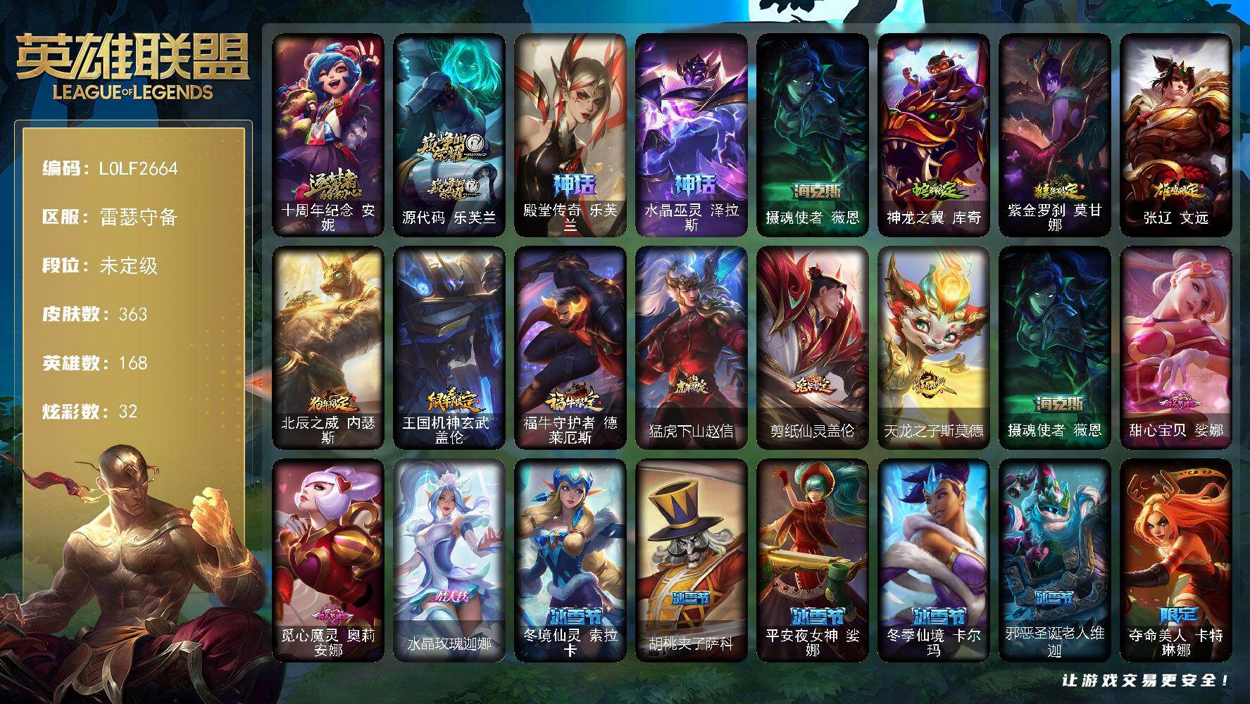 168英雄/363皮肤/1终极/5神话/80限定/8臻彩/32炫彩/49传说/47史诗/未定级账号等级:320/十周年纪念安妮/