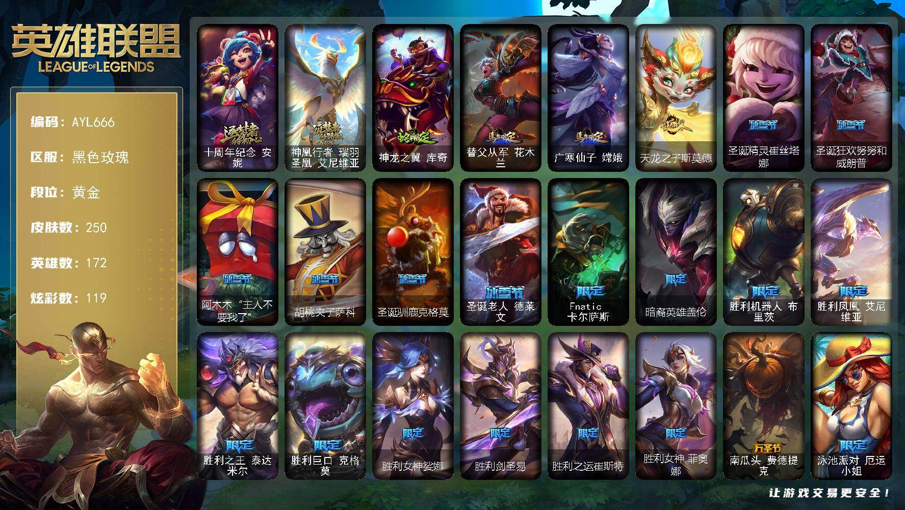 【特价出售/店主推荐】黄金段位-172英雄-250皮肤-119炫彩-0终极-