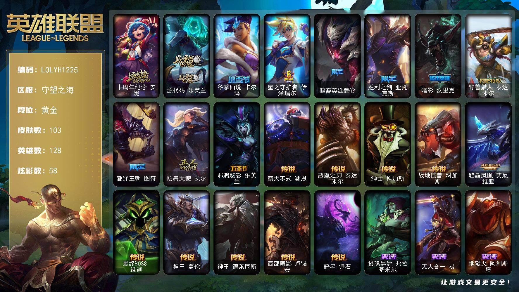 128英雄/103皮肤/2神话/9限定/4臻彩/58炫彩/11传说/22史诗/黄金/十周年纪念安妮/源代码乐芙兰/