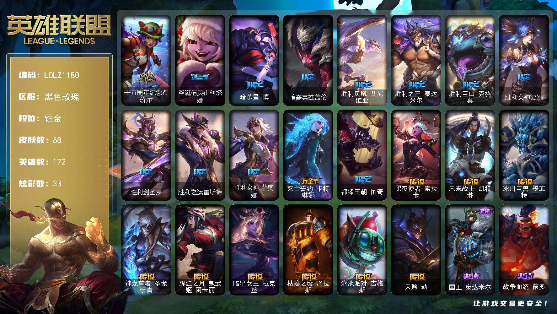 172英雄/68皮肤/1神话/13限定/4臻彩/33炫彩/9传说/10史诗/铂金账号等级:474/十五周年纪念希维尔