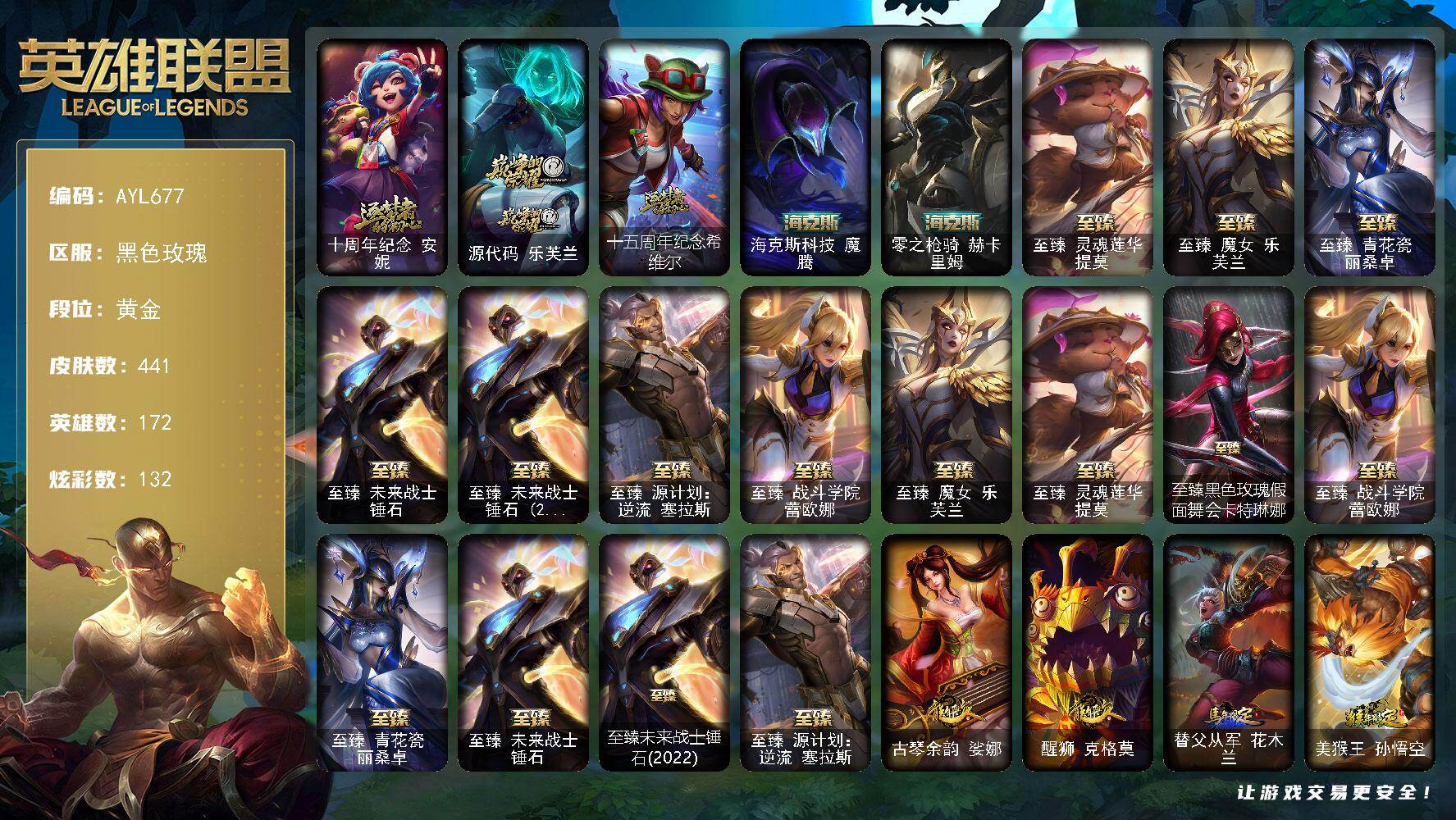 【店主推荐捡漏号】黄金段位-172英雄-441皮肤-132炫彩-1终极-13神