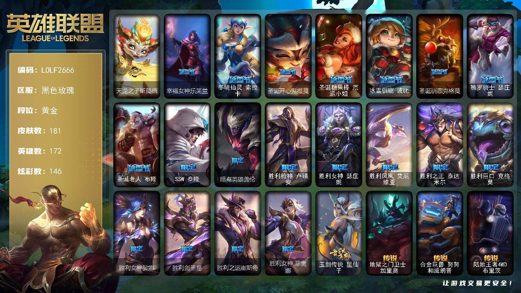 172英雄/181皮肤/22限定/5臻彩/146炫彩/8传说/42史诗/黄金/至爱的鹿头像/