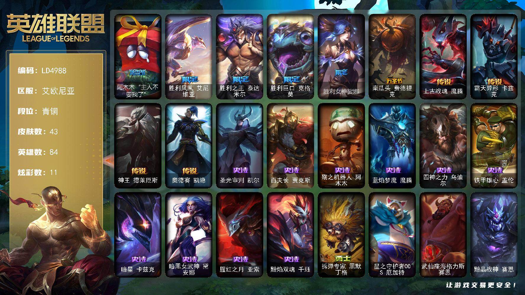 84英雄/43皮肤/6限定/11炫彩/4传说/10史诗/青铜账号等级:172/