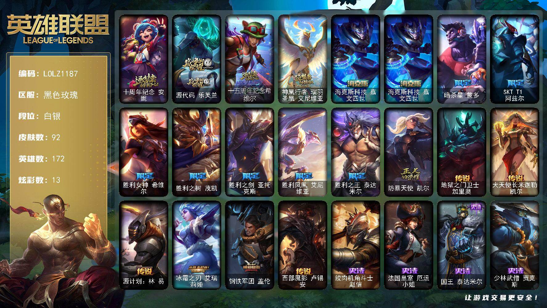 172英雄/92皮肤/5神话/8限定/1臻彩/13炫彩/6传说/38史诗/白银/十周年纪念安妮/源代码乐芙兰/