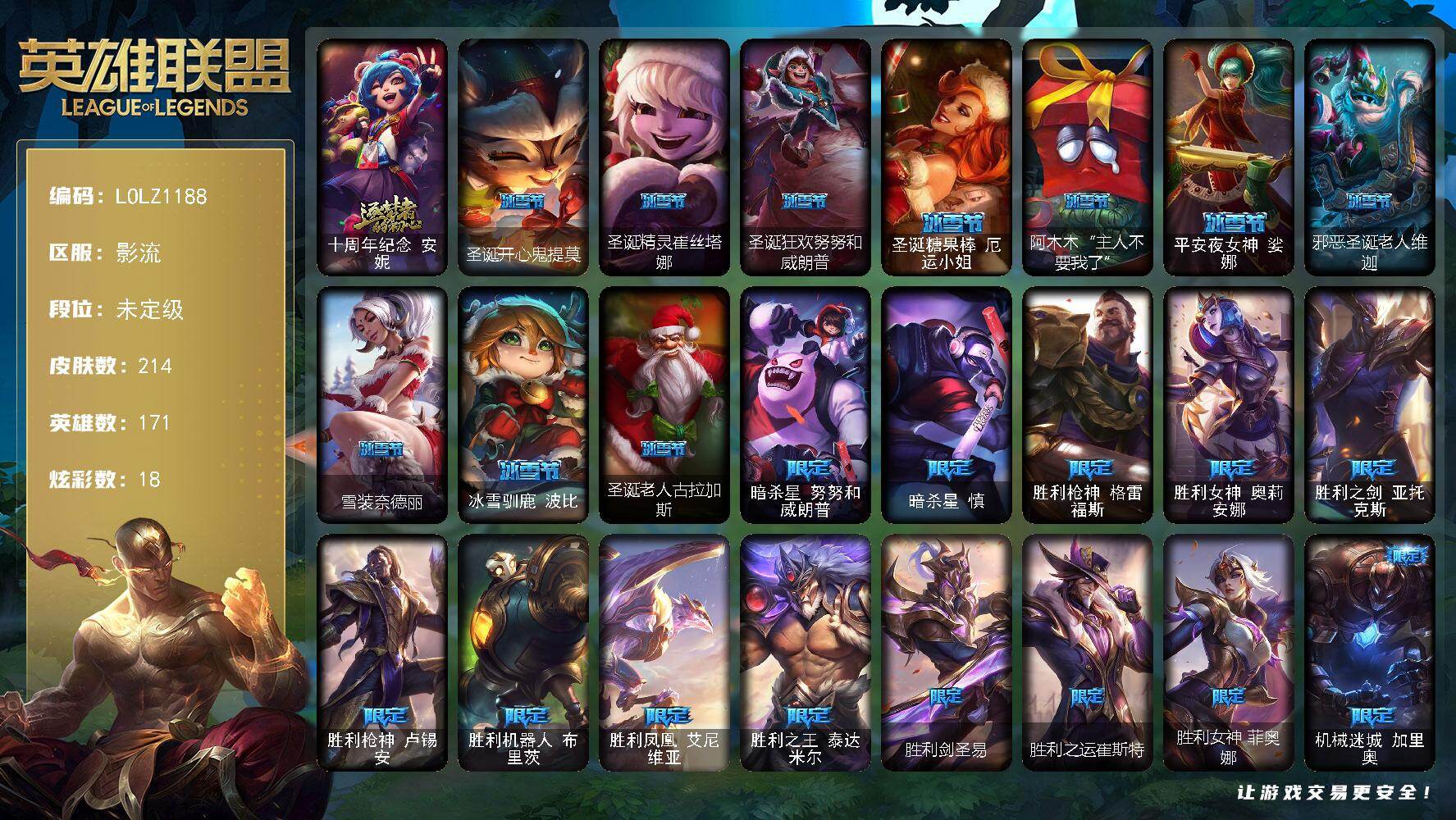 171英雄/214皮肤/1神话/31限定/18炫彩/10传说/50史诗/未定级/十周年纪念安妮/圣诞开心鬼提莫/圣诞精灵崔丝塔娜/