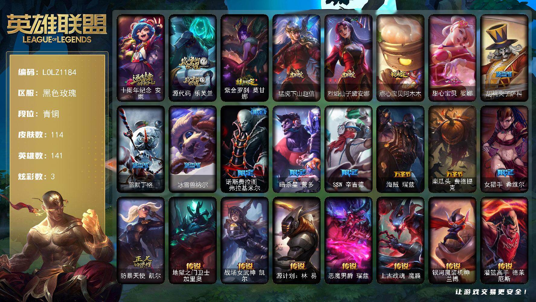 141英雄/114皮肤/2神话/15限定/3炫彩/7传说/30史诗/青铜/十周年纪念安妮/源代码乐芙兰/
