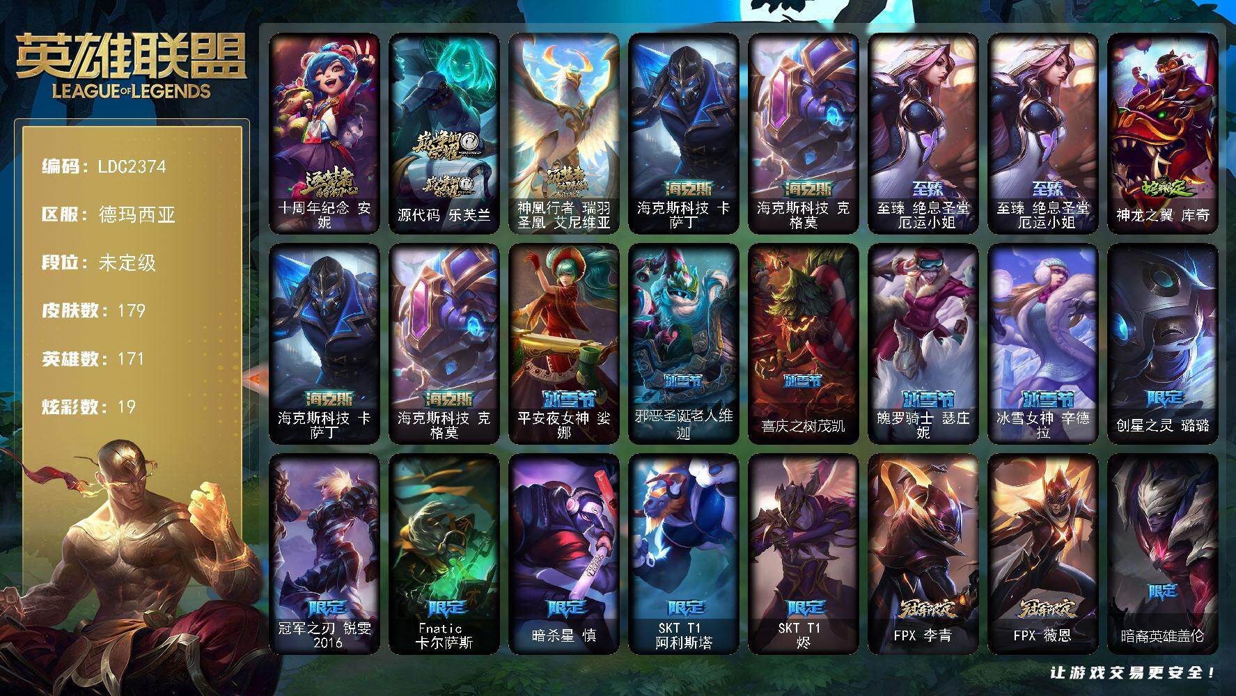 171英雄/179皮肤/6神话/25限定/3臻彩/19炫彩/19传说/50史诗/未定级/十周年纪念安妮/