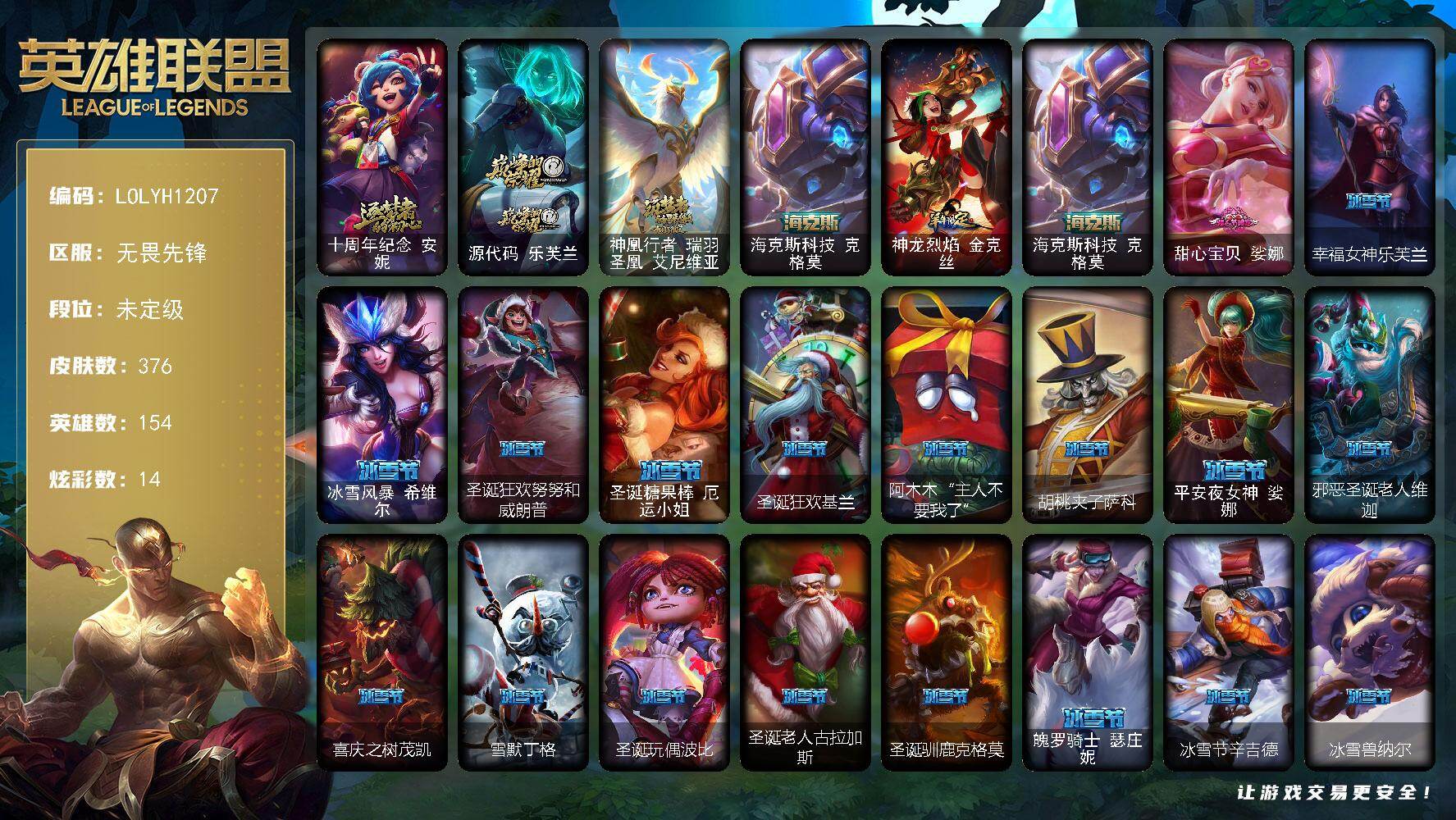 154英雄/376皮肤/2终极/4神话/61限定/2臻彩/14炫彩/40传说/105史诗/未定级/十周年纪念安妮/