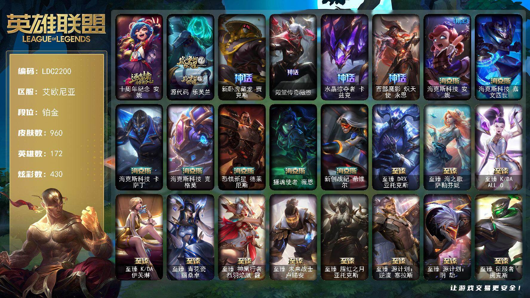172英雄/960皮肤/3终极/29神话/167限定/27臻彩/430炫彩/87传说/210史诗/铂金/十周年纪念安妮/