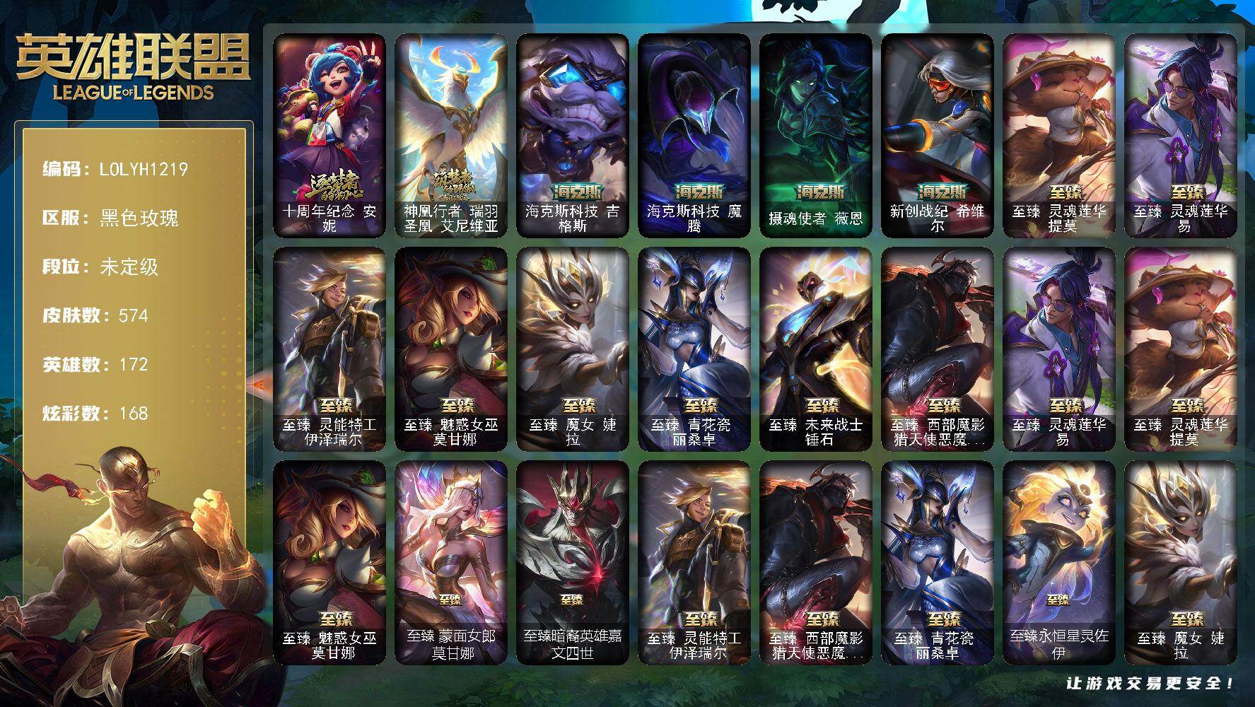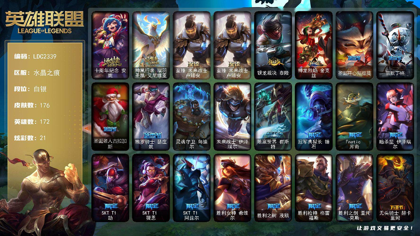 172英雄/176皮肤/2终极/3神话/23限定/1臻彩/21炫彩/13传说/48史诗/白银/十周年纪念安妮/