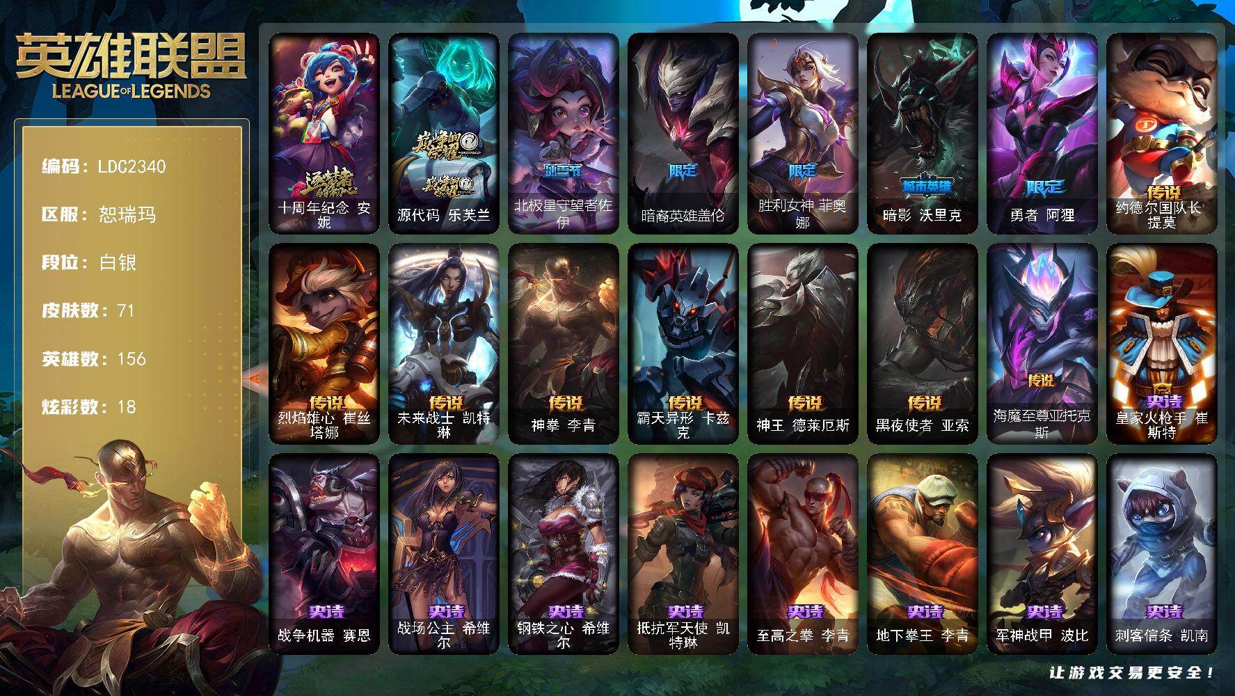 156英雄/71皮肤/2神话/6限定/4臻彩/18炫彩/8传说/17史诗/白银/十周年纪念安妮/
