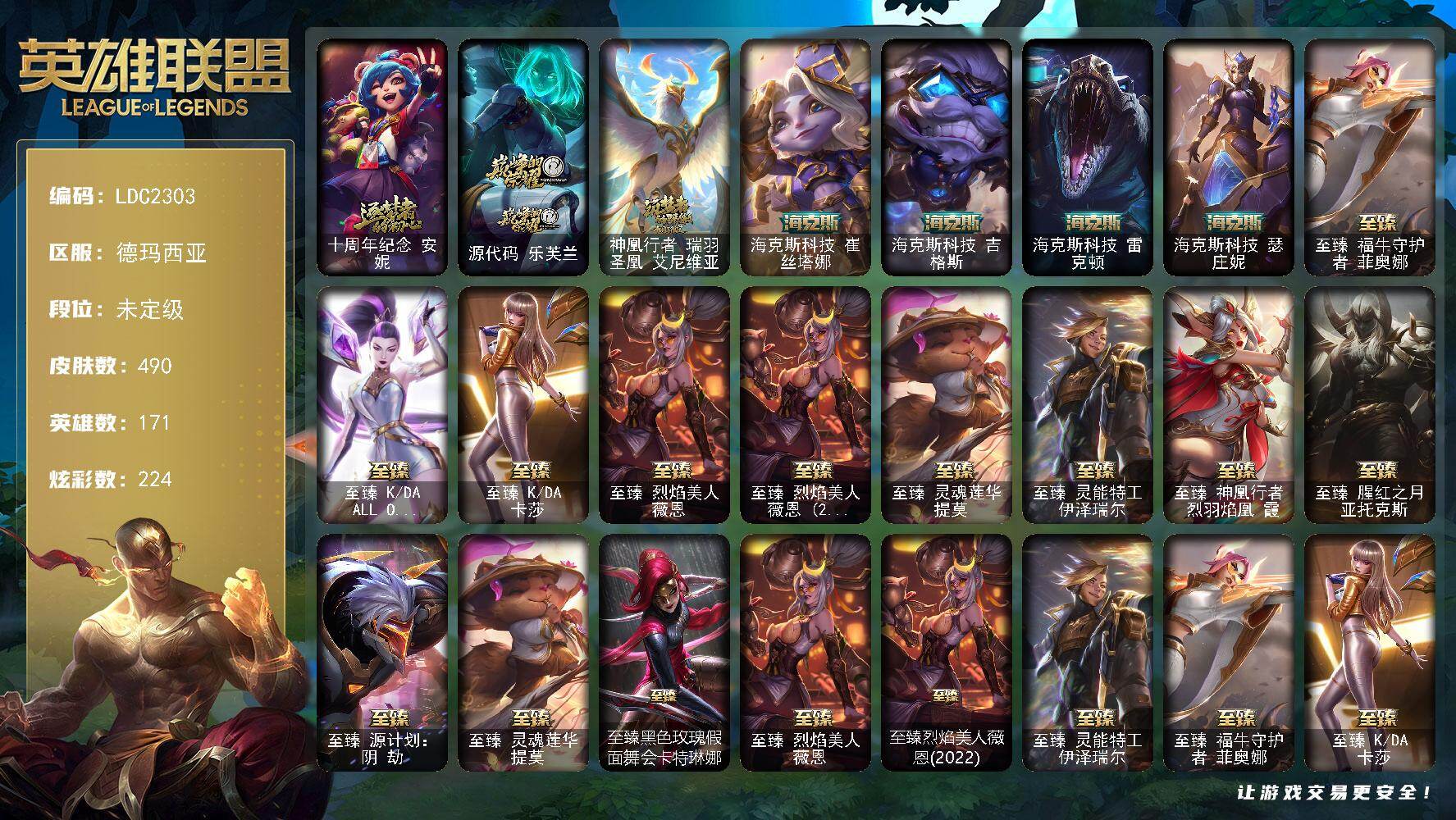171英雄/490皮肤/1终极/18神话/73限定/11臻彩/224炫彩/60传说/102史诗/未定级/十周年纪念安妮/