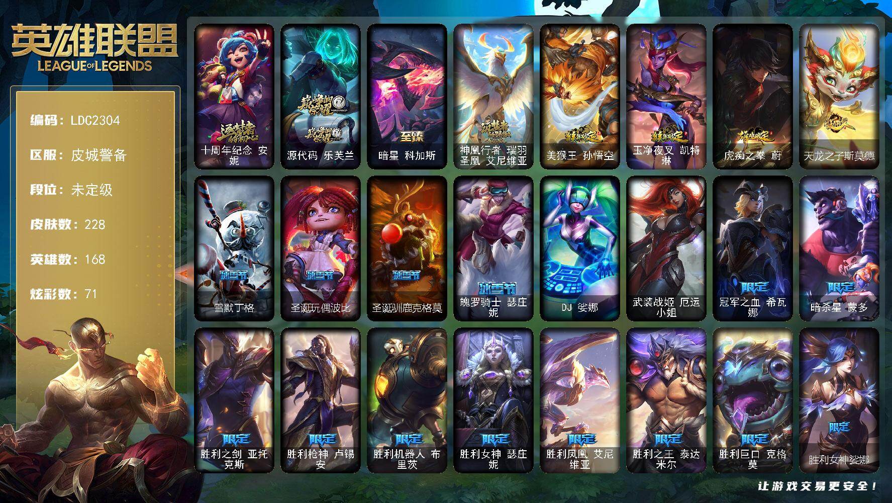 168英雄/228皮肤/2终极/4神话/24限定/2臻彩/71炫彩/21传说/67史诗/未定级/十周年纪念安妮/