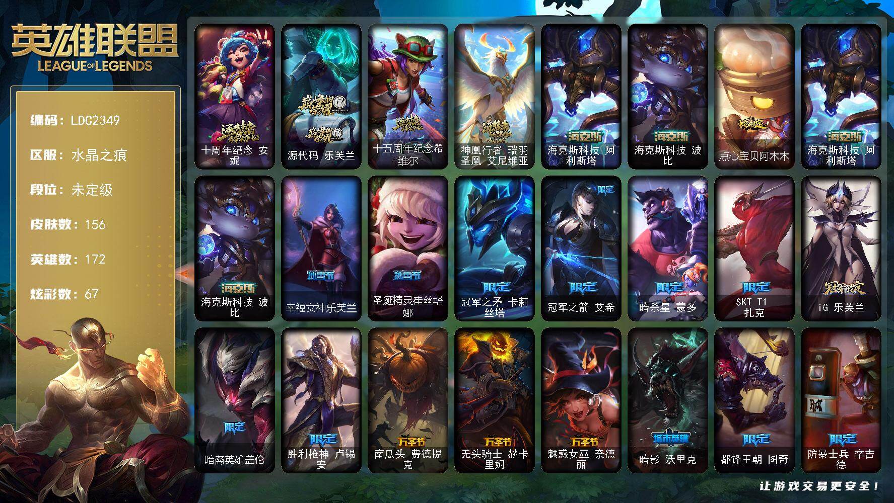 172英雄/156皮肤/6神话/17限定/7臻彩/67炫彩/17传说/36史诗/未定级账号等级:307/十周年纪念安妮/