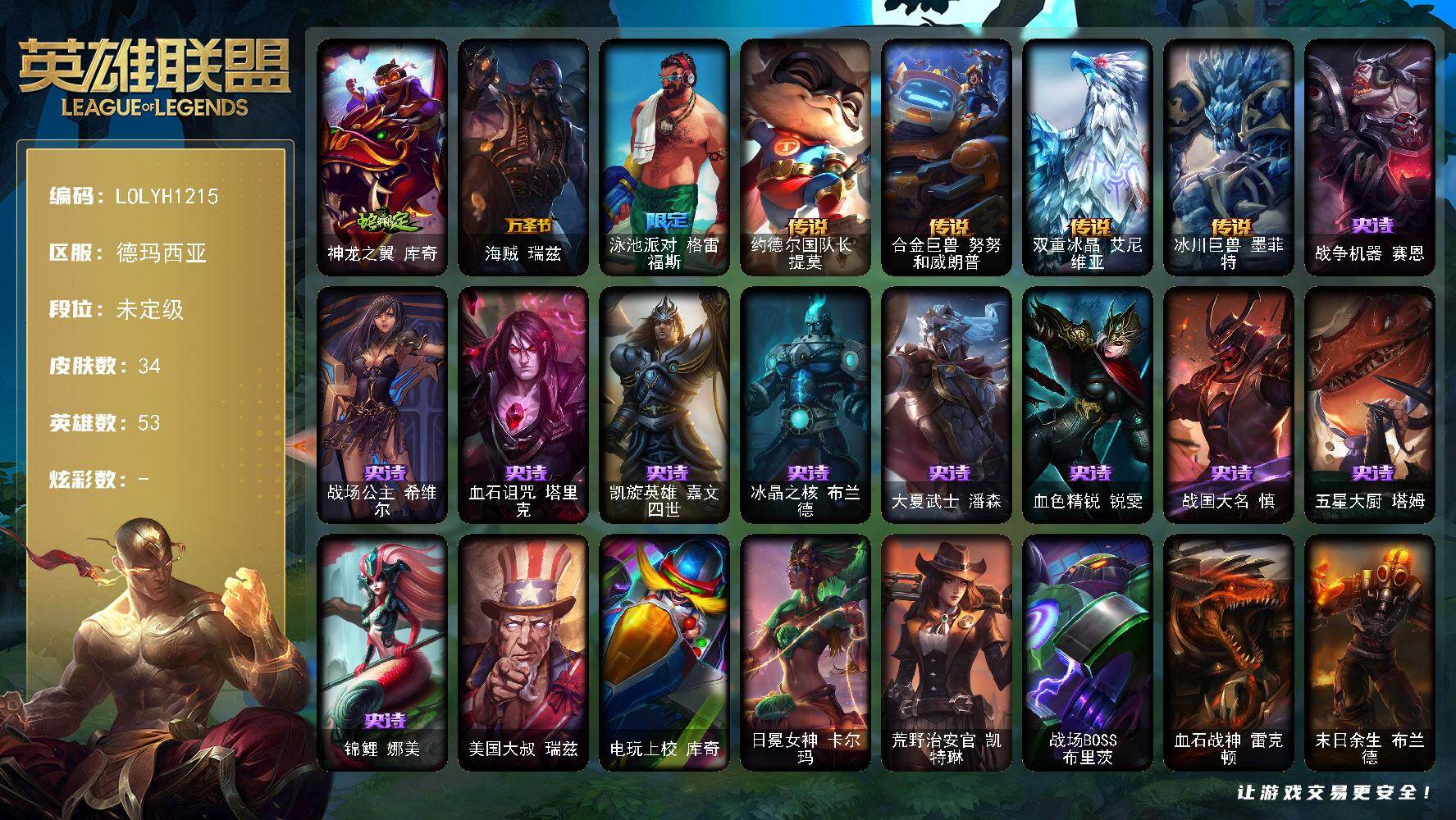 53英雄/34皮肤/3限定/4传说/10史诗/未定级/神龙之翼库奇/海贼瑞兹/泳池派对格雷福斯/