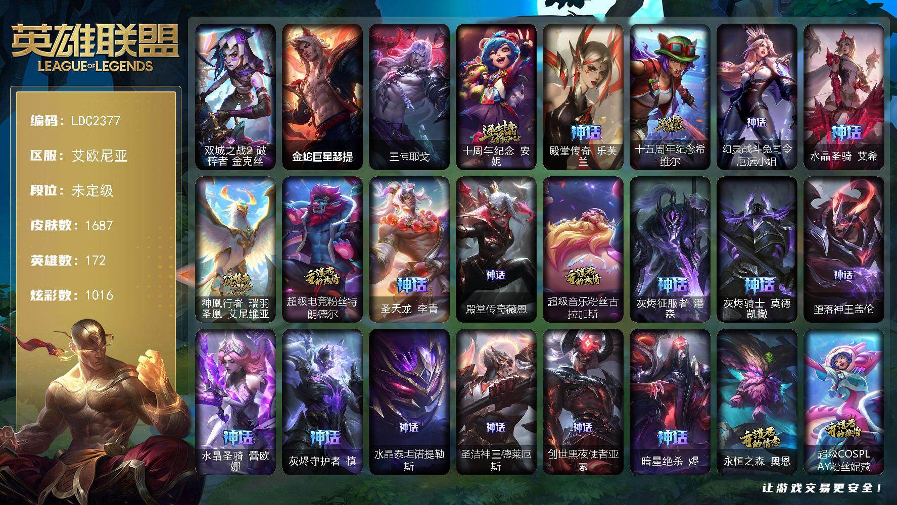 172英雄/1687皮肤/9终极/106神话/340限定/100臻彩/1016炫彩/129传说/215史诗/未定级账号等级:650