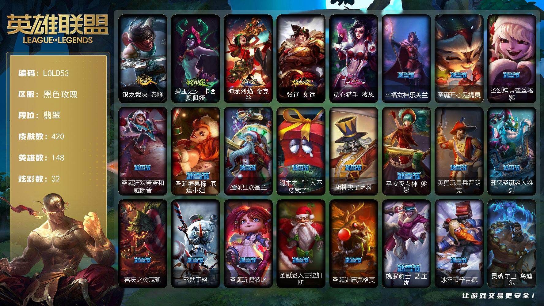 148英雄/420皮肤/2终极/73限定/32炫彩/40传说/124史诗/流光翡翠/