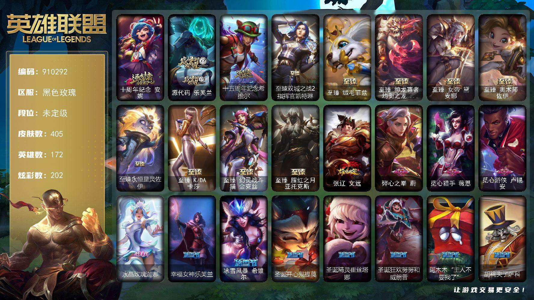 未定级段位-172英雄-405皮肤-202炫彩-2终极-12神话-59限定-34传说-89史诗