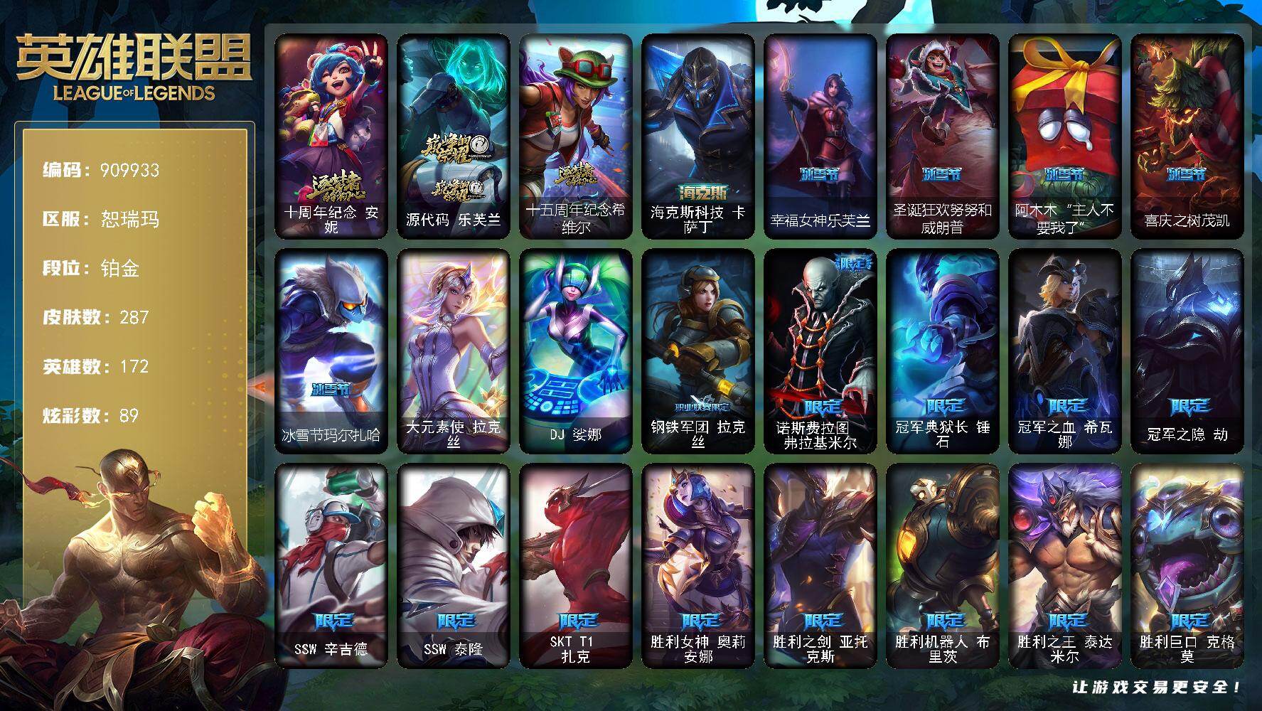 铂金段位-172英雄-287皮肤-89炫彩-2终极-4神话-28限定-22传说-60史诗