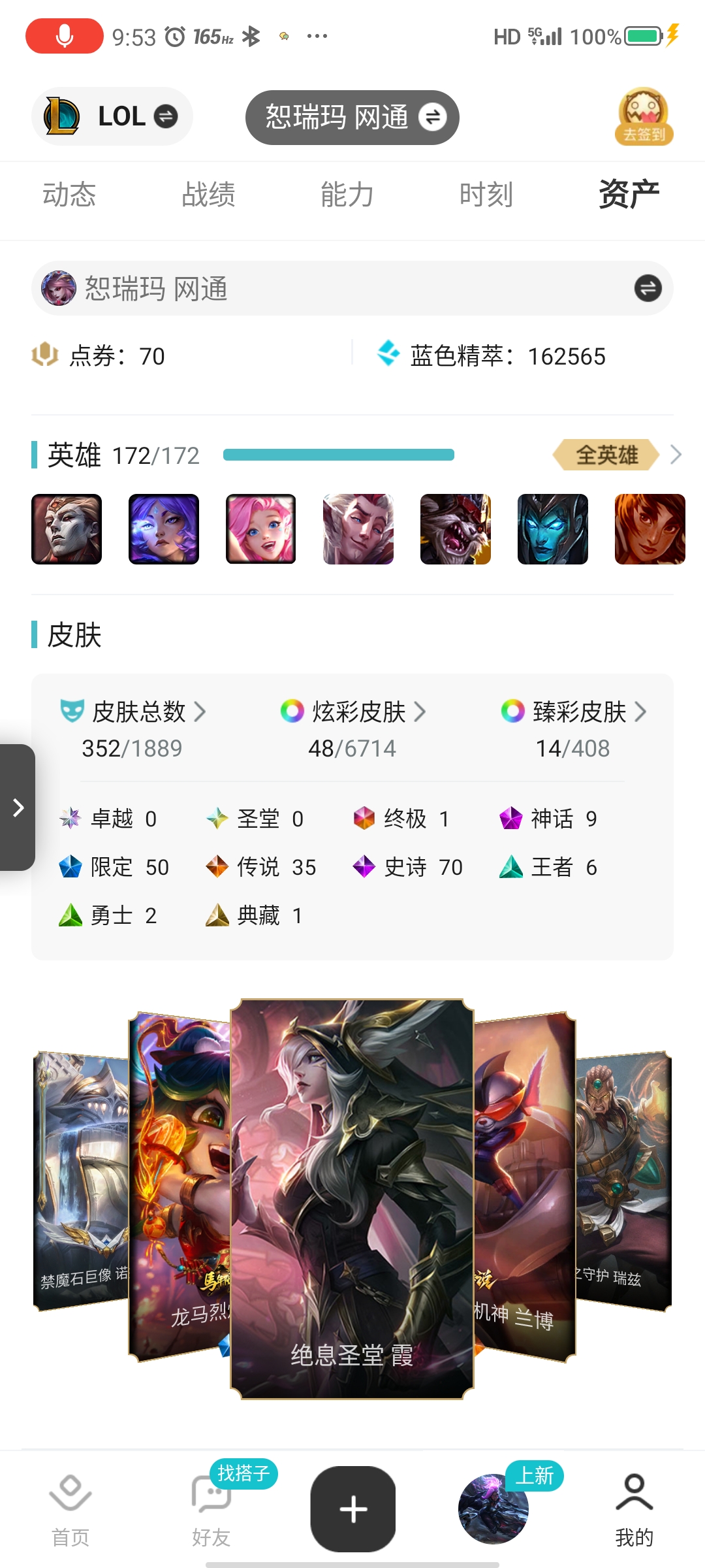 未定级段位-172英雄-581皮肤-601炫彩-3终极-38神话-93限定-7