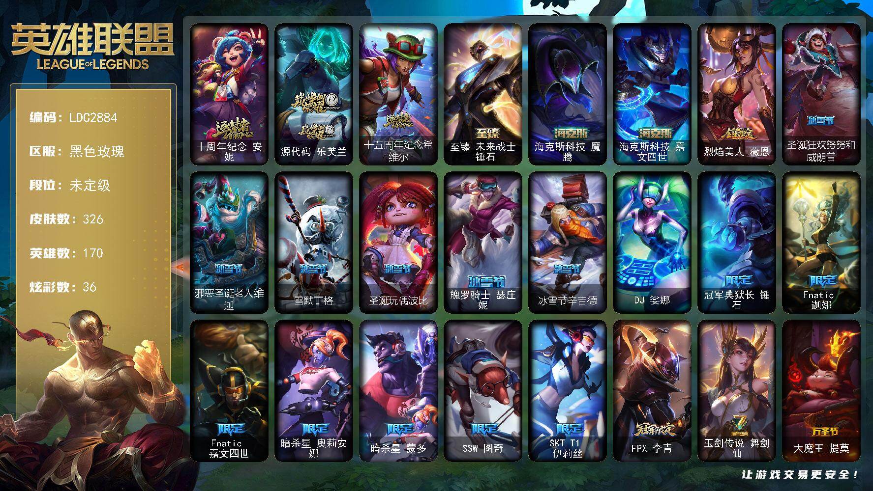 170英雄/326皮肤/1终极/6神话/31限定/2臻彩/36炫彩/37传说/72史诗/未定级/