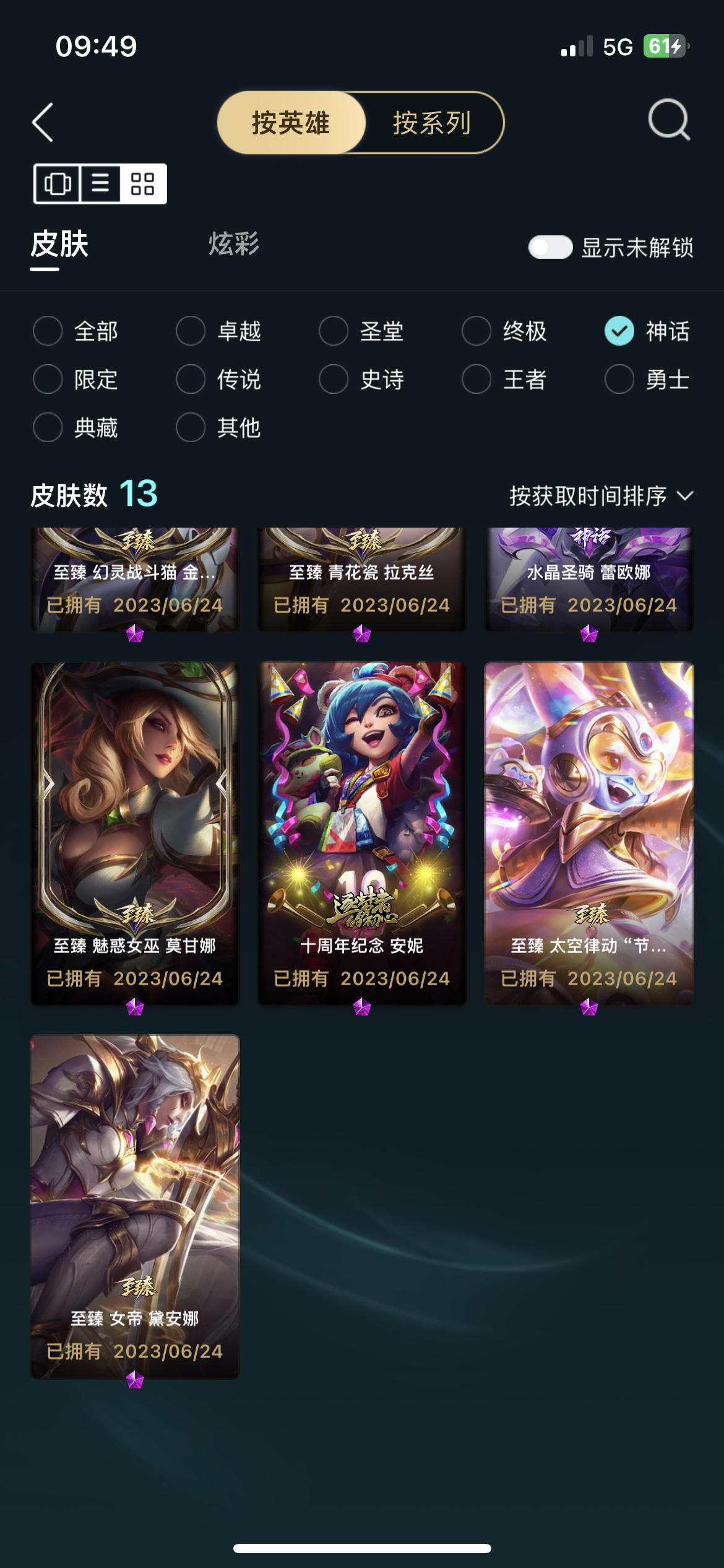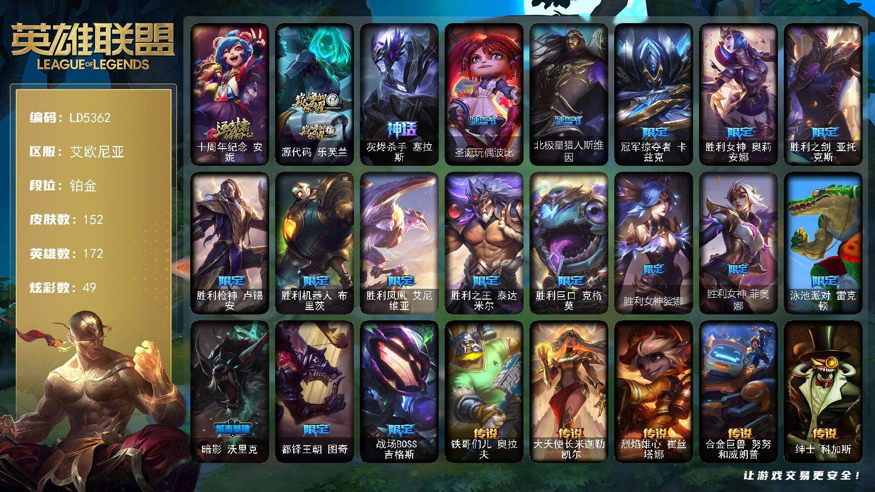 172英雄/152皮肤/3神话/17限定/2臻彩/49炫彩/14传说