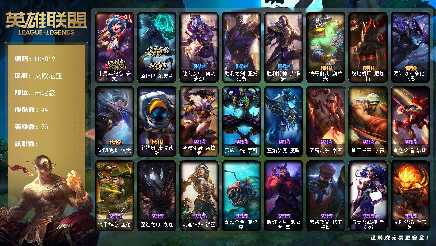 96英雄/44皮肤/2神话/3限定/1炫彩/5传说/18史诗/未定级/十周年纪念安妮/源代码乐芙兰