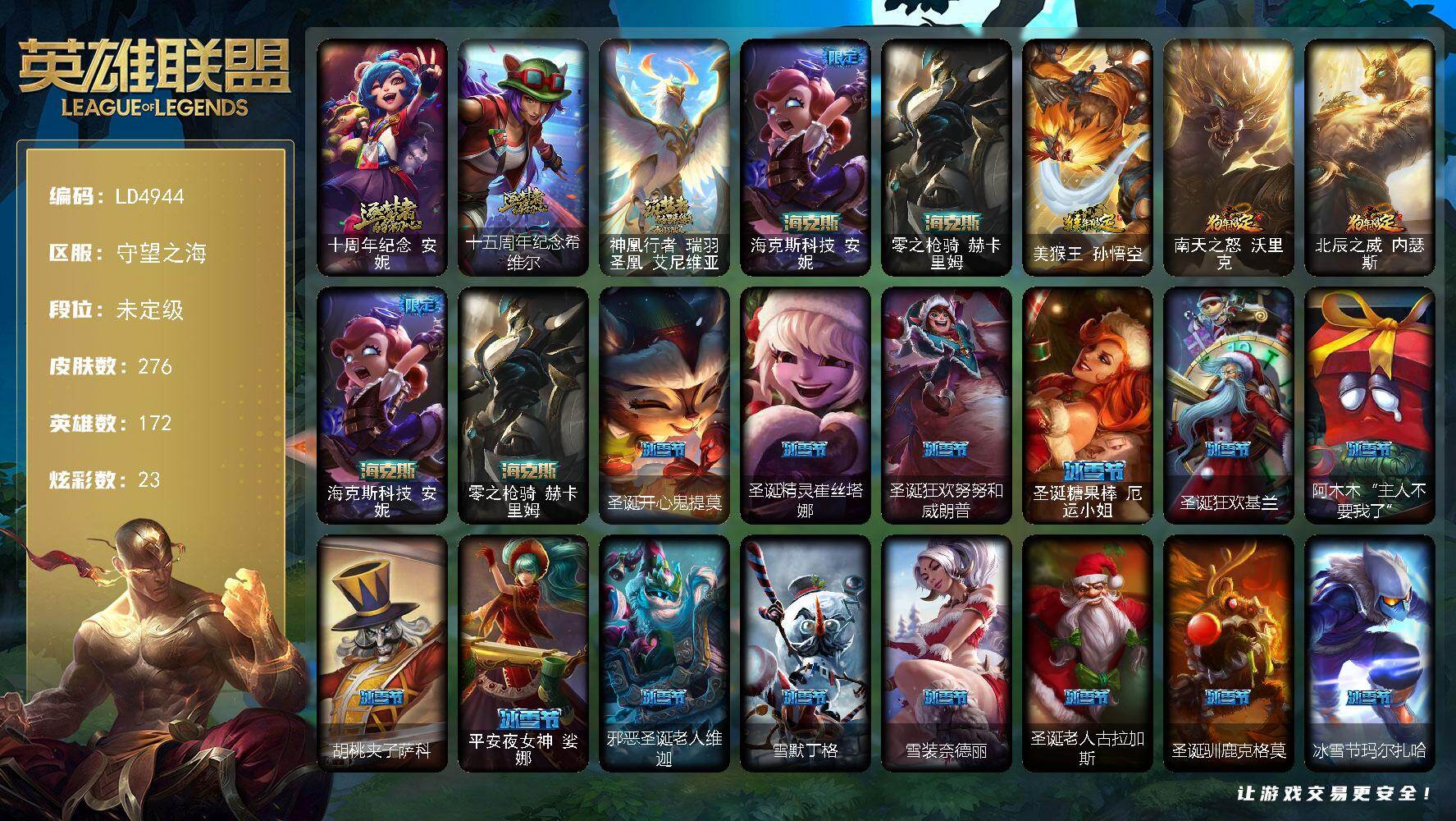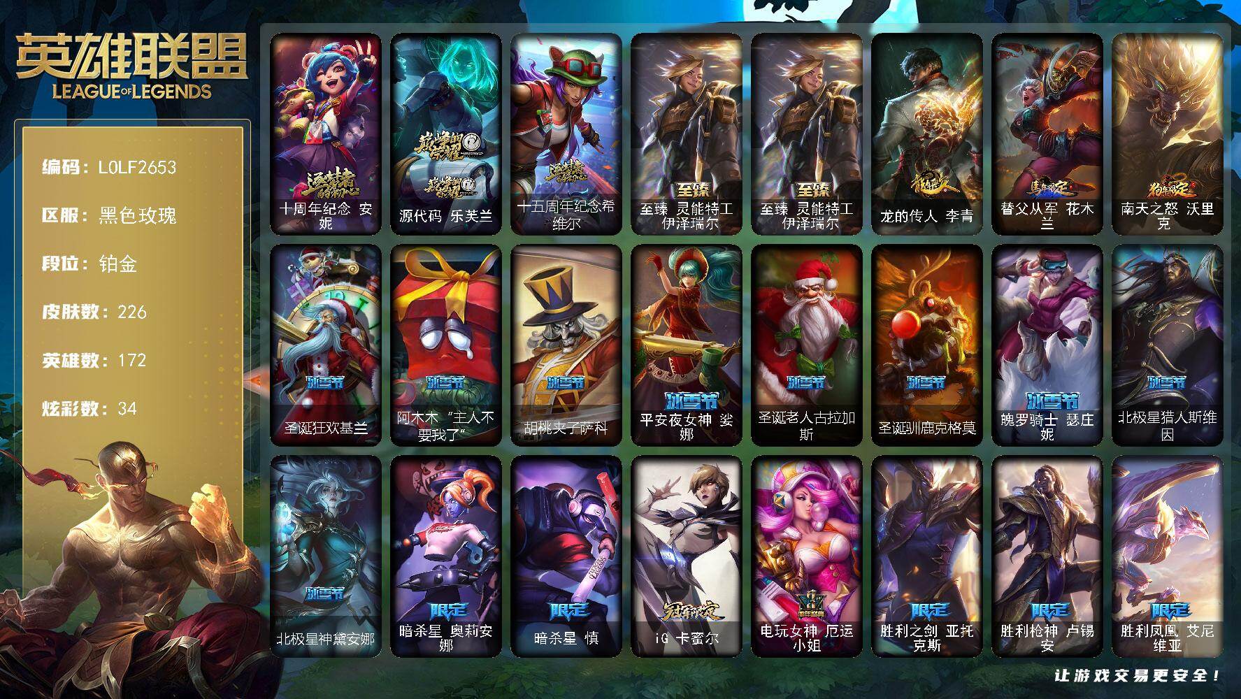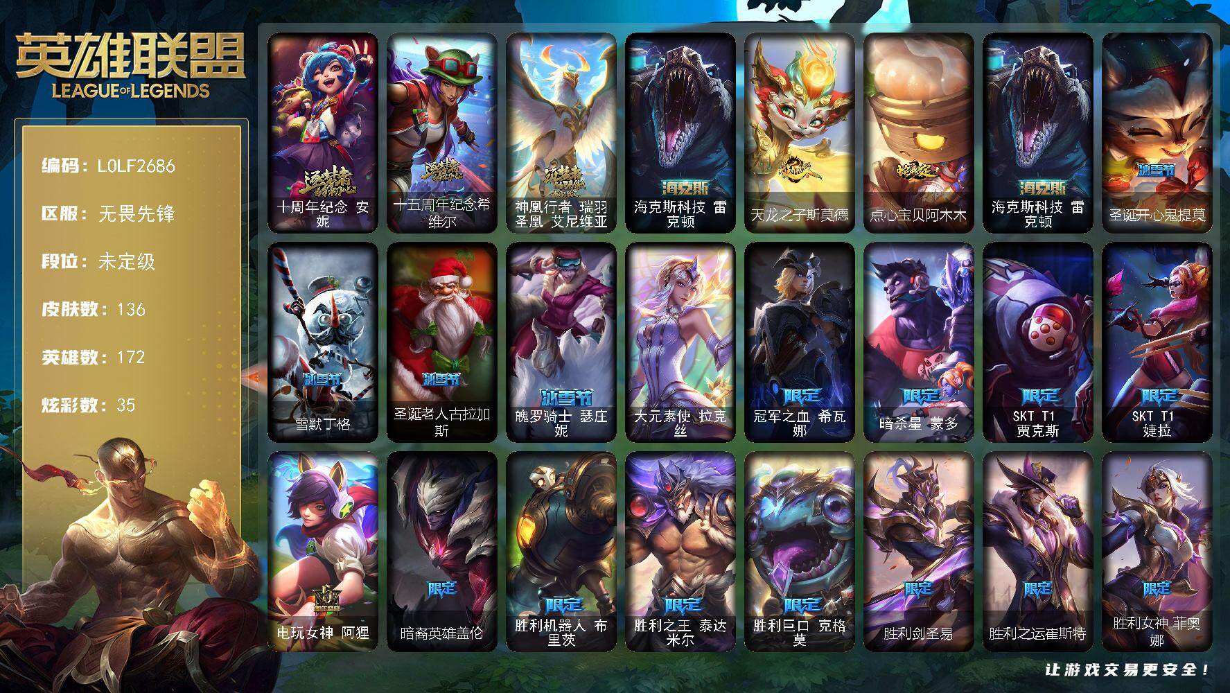 172英雄/226皮肤/4神话/35限定/1臻彩/34炫彩/12传说/46史诗/铂金/十周年纪念安妮