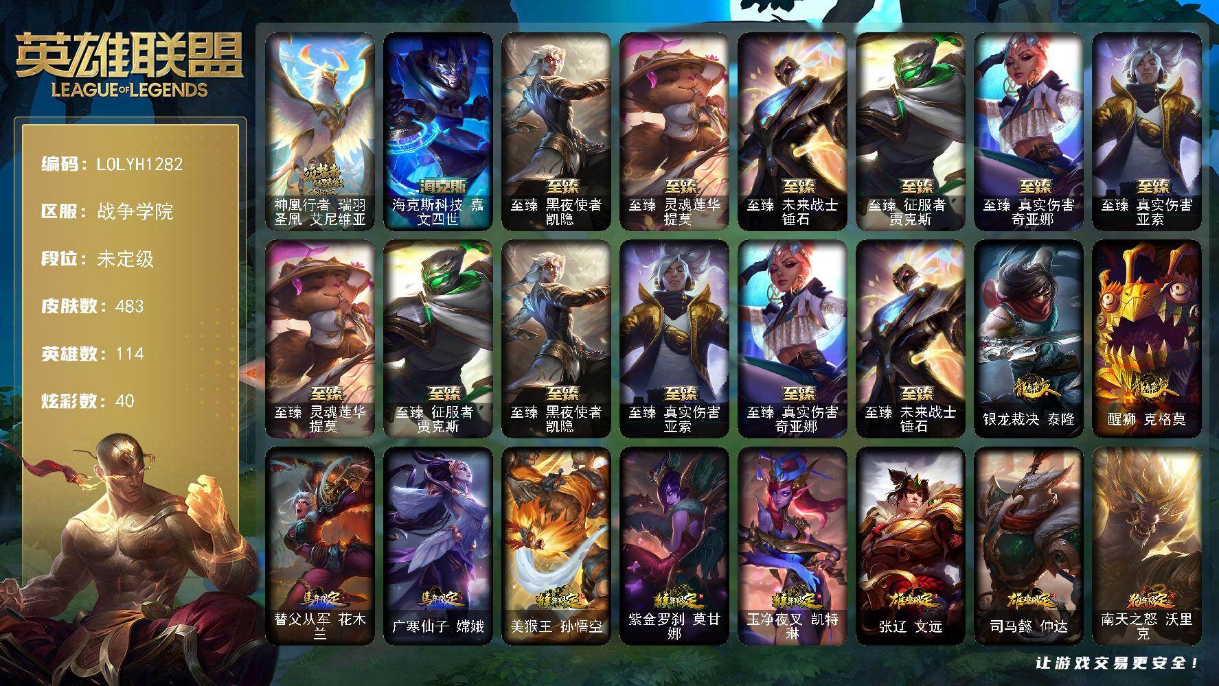 114英雄/483皮肤/1终极/8神话/80限定/1臻彩/40炫彩/48传说/124史诗/未定级/