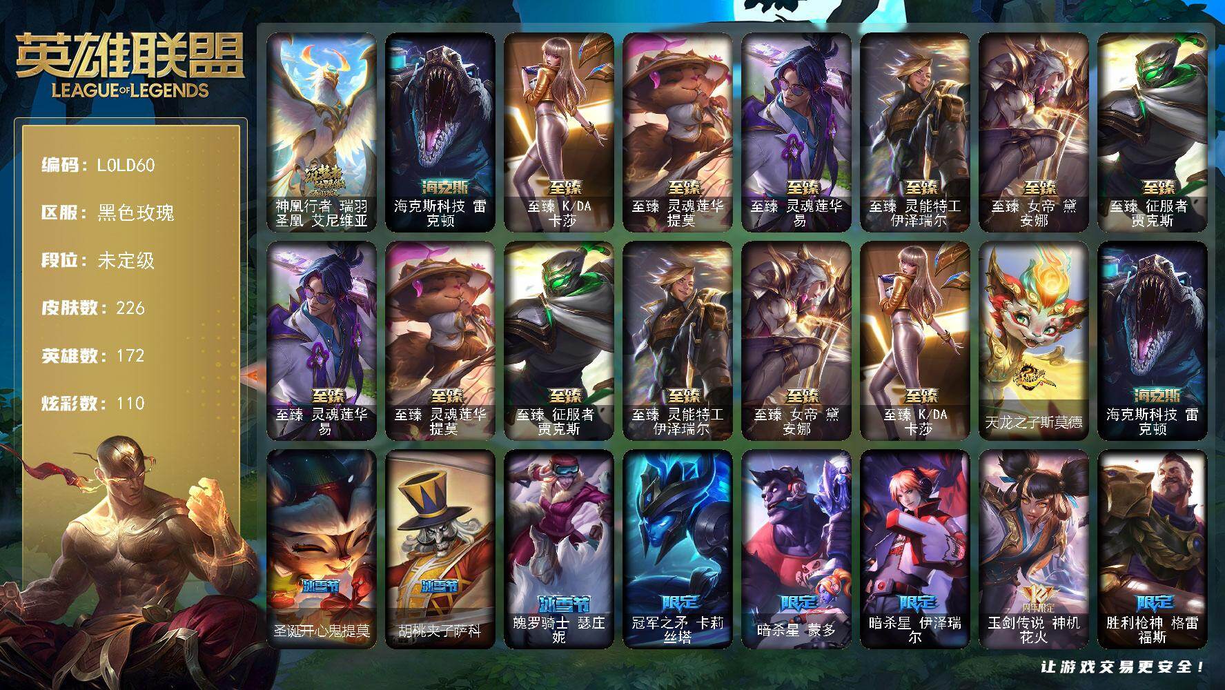 172英雄/226皮肤/8神话/25限定/6臻彩/110炫彩/30传说/45史诗/未定级账号等级:571/