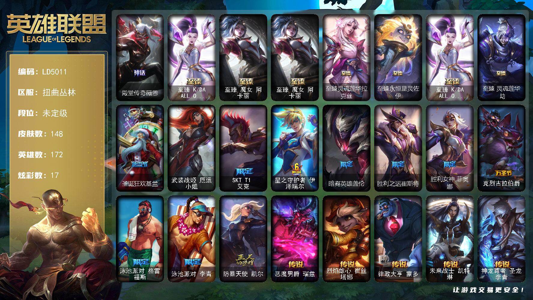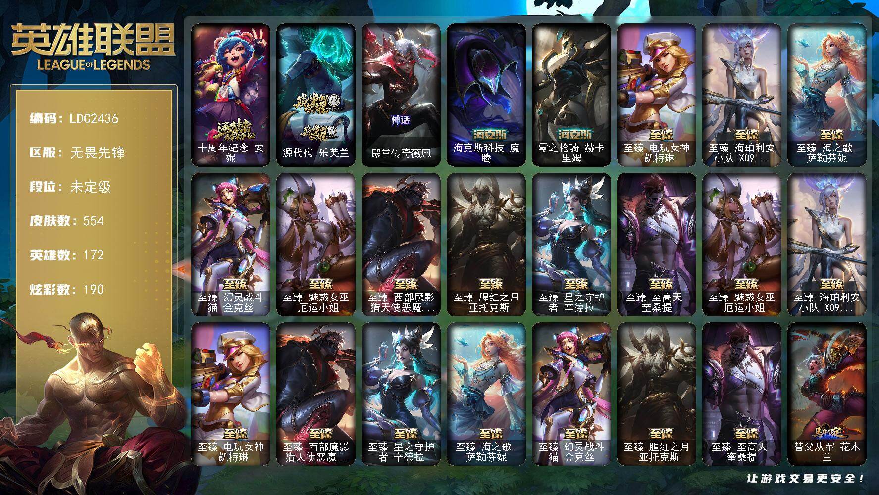 172英雄/554皮肤/5终极/14神话/70限定/18臻彩/190炫彩/65传说/157史诗/未定级