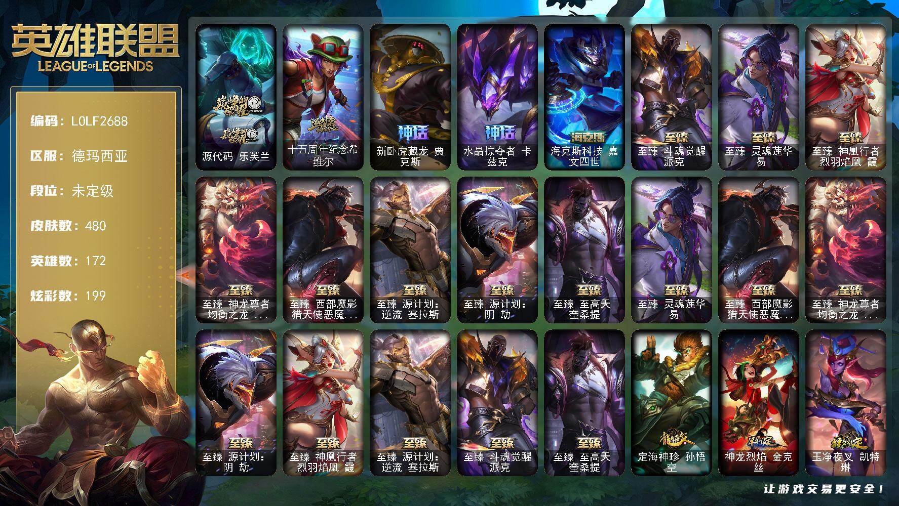 171英雄/288皮肤/2神话/62限定/76炫彩/32传说/71史诗/未定级账号等级:490/