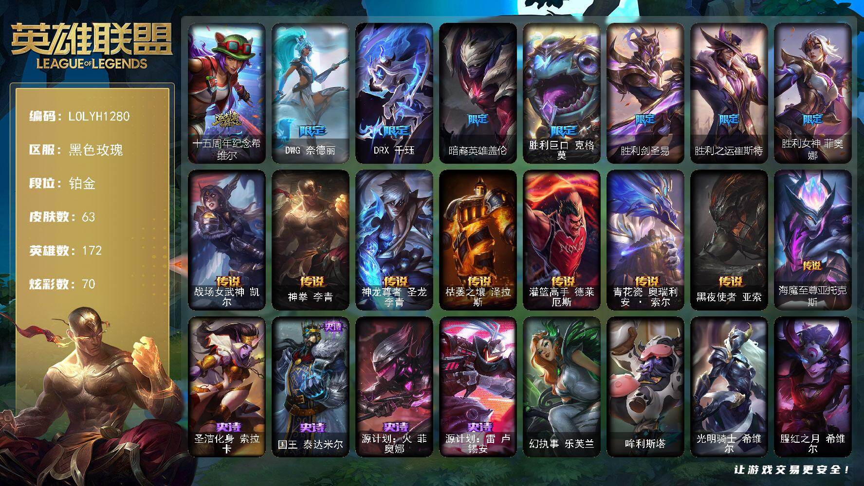 172英雄/63皮肤/1神话/8限定/5臻彩/70炫彩/8传说/4史诗/铂金/