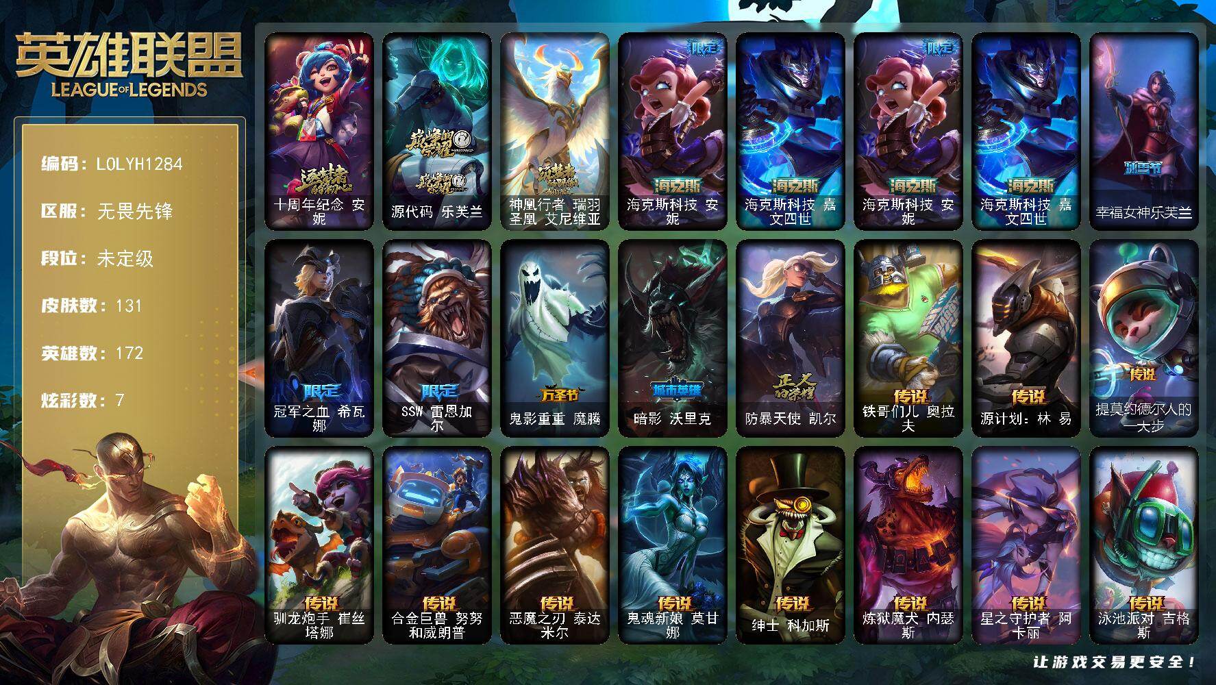 172英雄/131皮肤/5神话/6限定/1臻彩/7炫彩/12传说/36史诗/未定级/十周年纪念安妮/