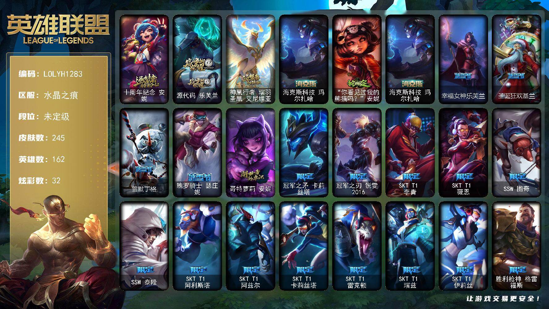 162英雄/245皮肤/4神话/30限定/3臻彩/32炫彩/16传说/69史诗/未定级/十周年纪念安妮/