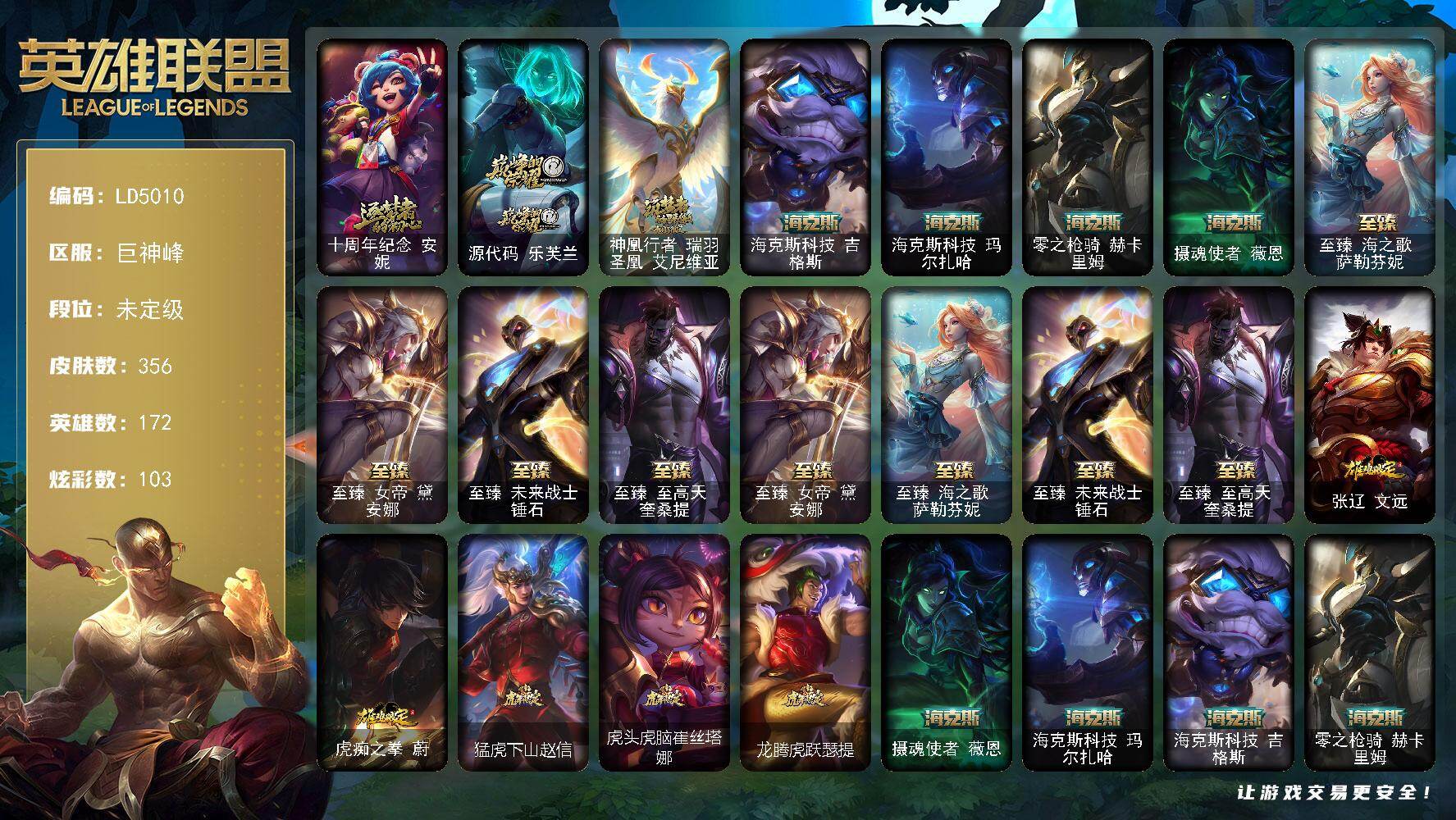 172英雄/356皮肤/1终极/11神话/71限定/6臻彩/103炫彩/43传说/62史诗/未定级/