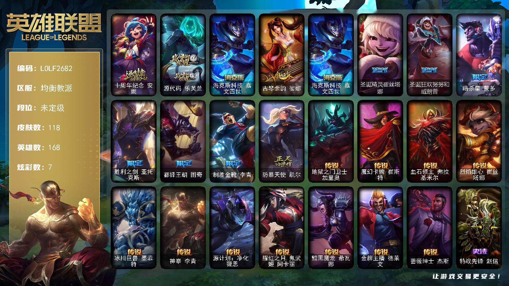 168英雄/118皮肤/3神话/8限定/1臻彩/7炫彩/11传说/31史诗/未定级