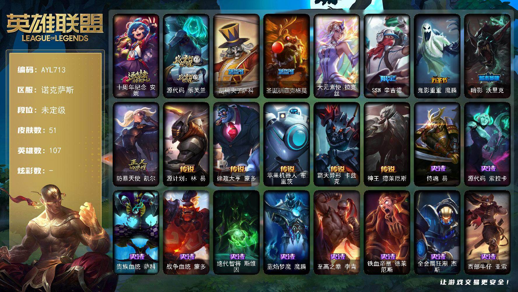 未定级段位-107英雄-51皮肤-0炫彩-1终极-2神话-6限定-5传说-15
