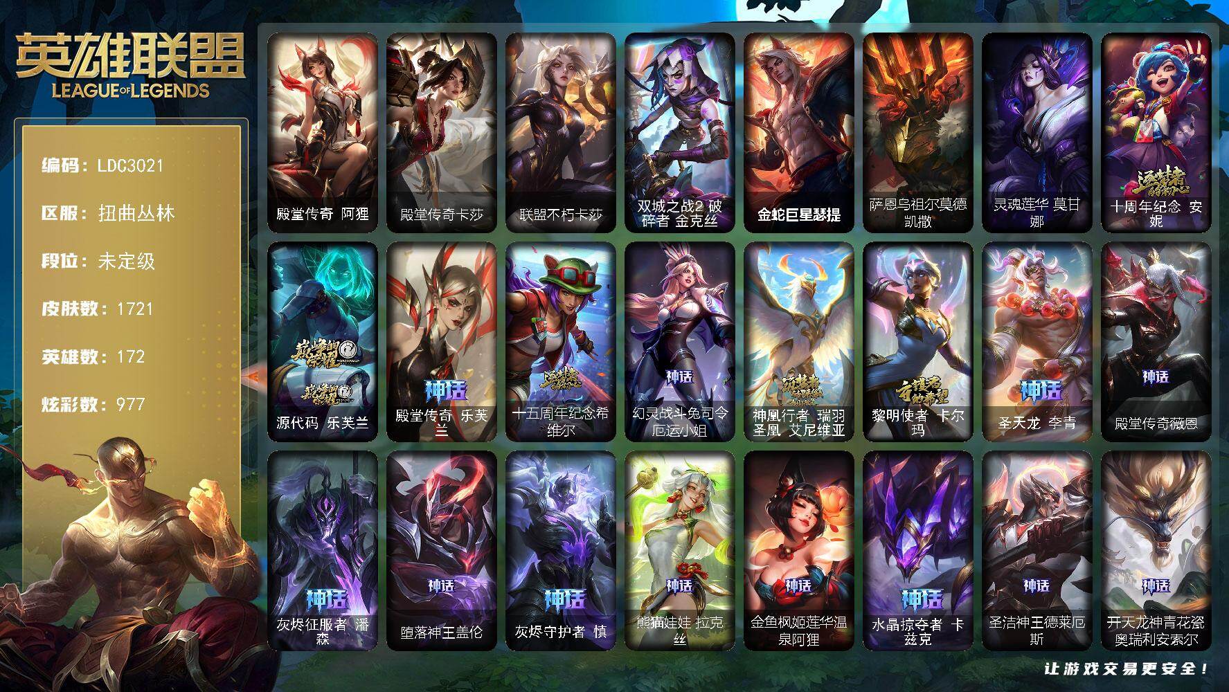 未定级段位-172英雄-1721皮肤-977炫彩-8终极-102神话-350限定-134传说-215史诗