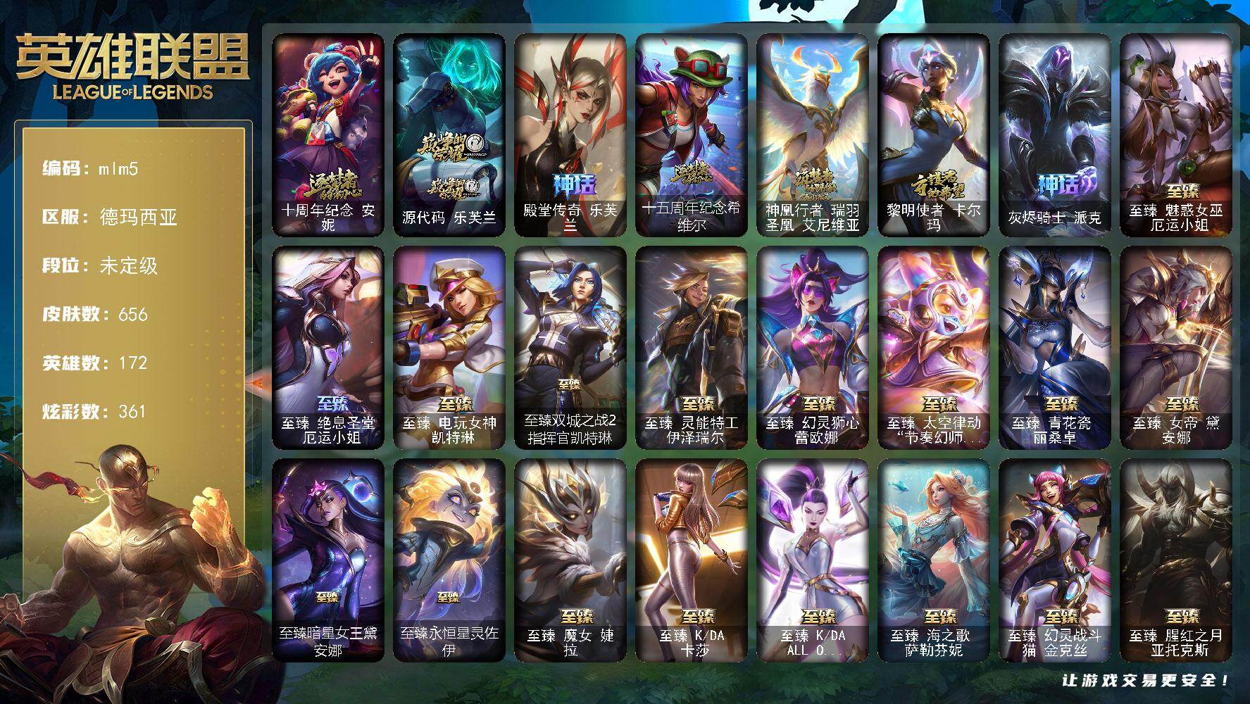【mlm5】未定级段位-172英雄-656皮肤-361炫彩-2终极-28神话-