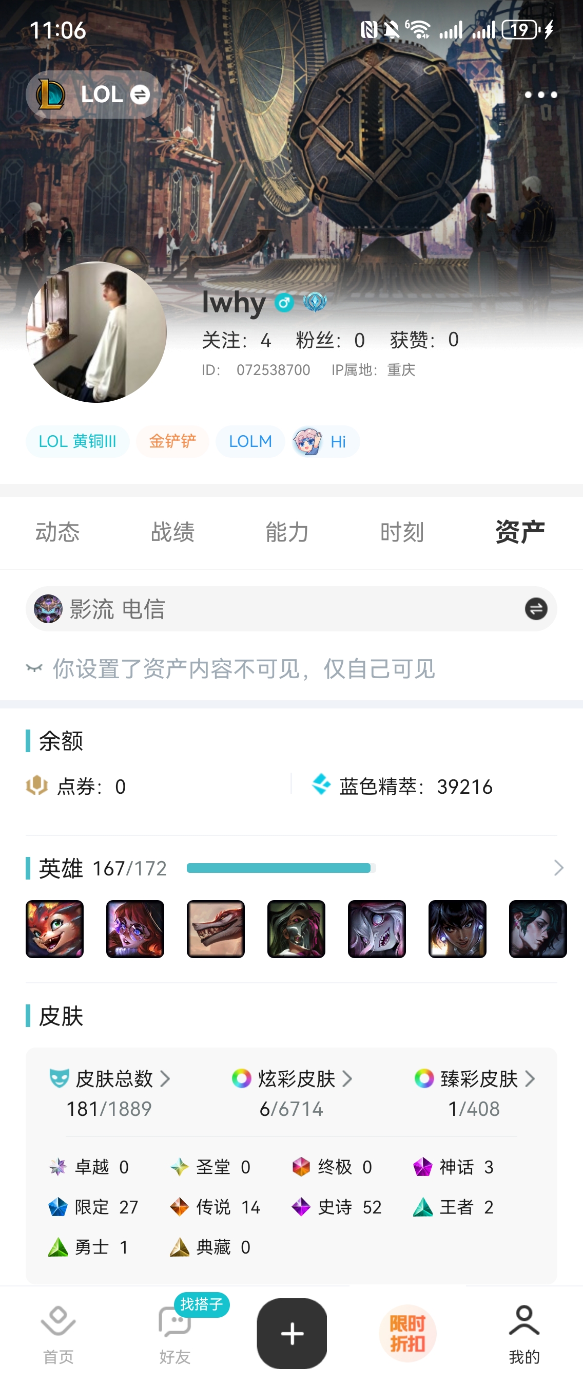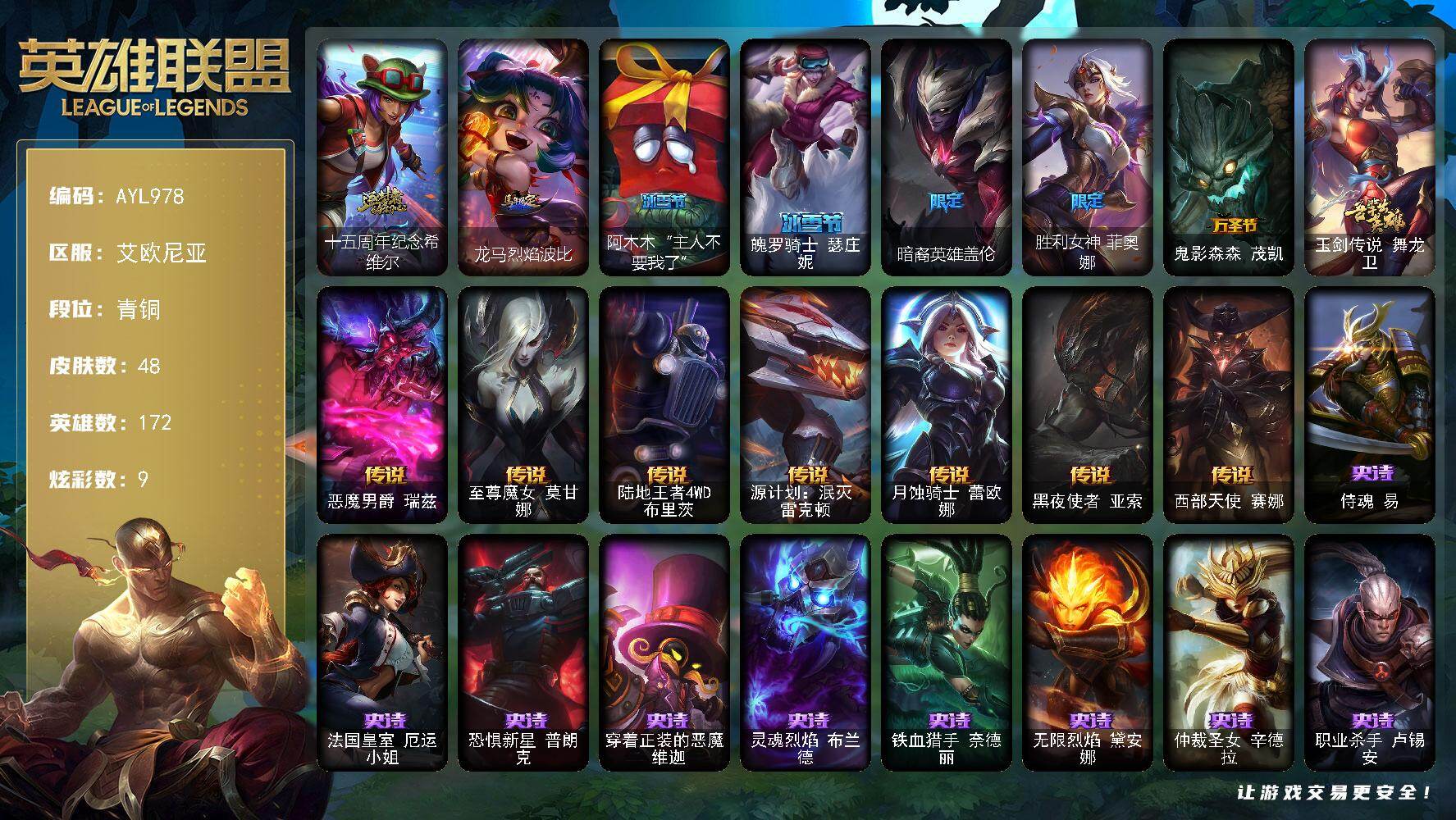 青铜段位-172英雄-48皮肤-9炫彩-0终极-1神话-8限定-7传说-9史诗
