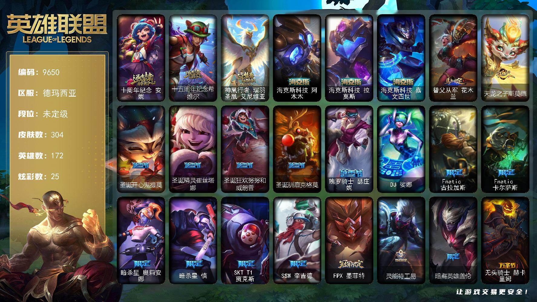 未定级段位-172英雄-304皮肤-25炫彩-1终极-6神话-24限定-25传说-8