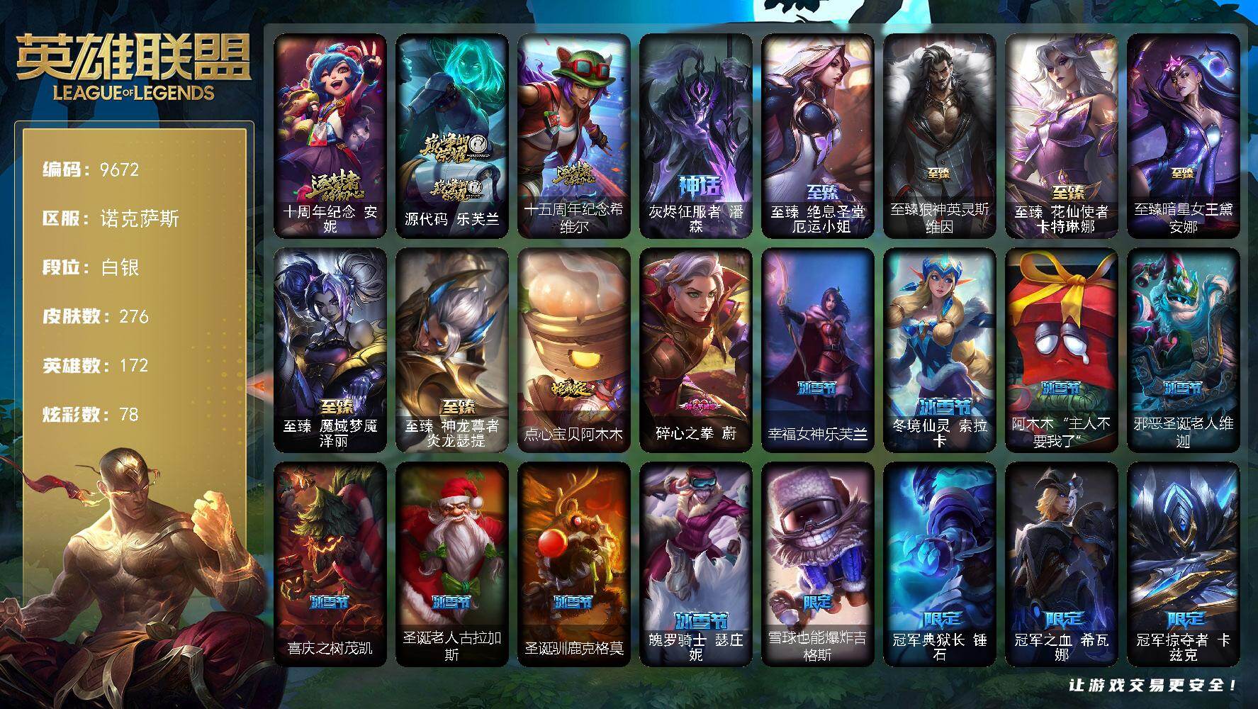 白银段位-172英雄-276皮肤-78炫彩-0终极-10神话-38限定-37传说-5