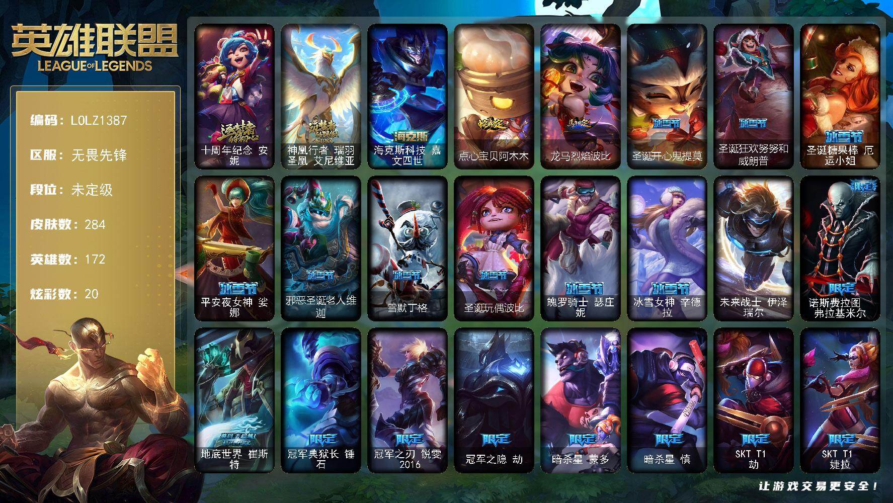 未定级段位-172英雄-284皮肤-20炫彩-1终极-3神话-34限定-23传说-7