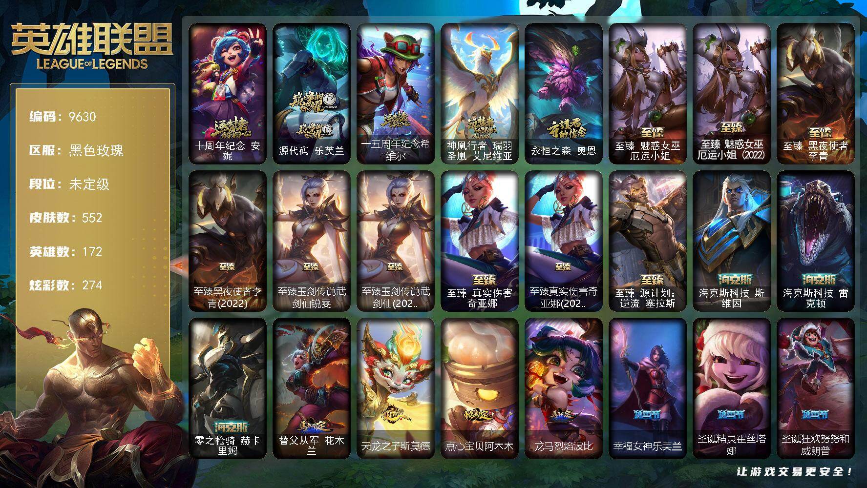 未定级段位-172英雄-552皮肤-274炫彩-2终极-17神话-72限定-50传说