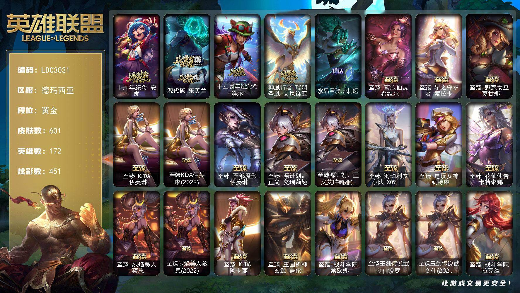 黄金段位-172英雄-601皮肤-451炫彩-2终极-47神话-76限定-68传说-