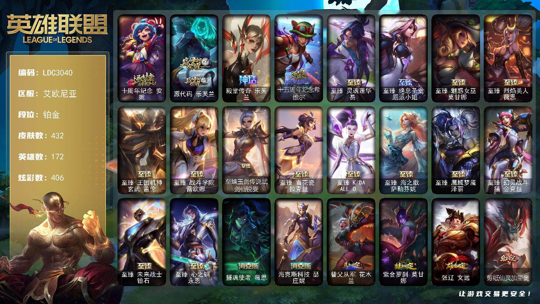 铂金段位-172英雄-432皮肤-406炫彩-2终极-20神话-70限定-65传说-