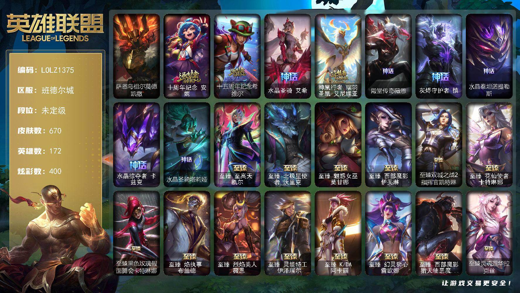未定级段位-172英雄-670皮肤-400炫彩-7终极-52神话-61限定-73传说-130史诗