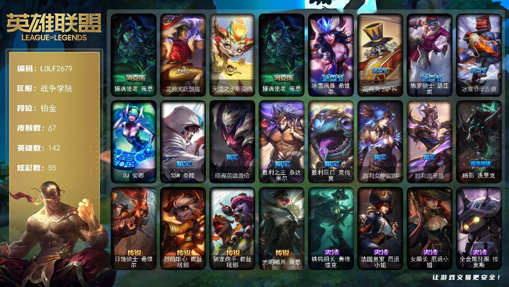 142英雄/67皮肤/1终极/1神话/13限定/5臻彩/55炫彩/4传说/10史诗